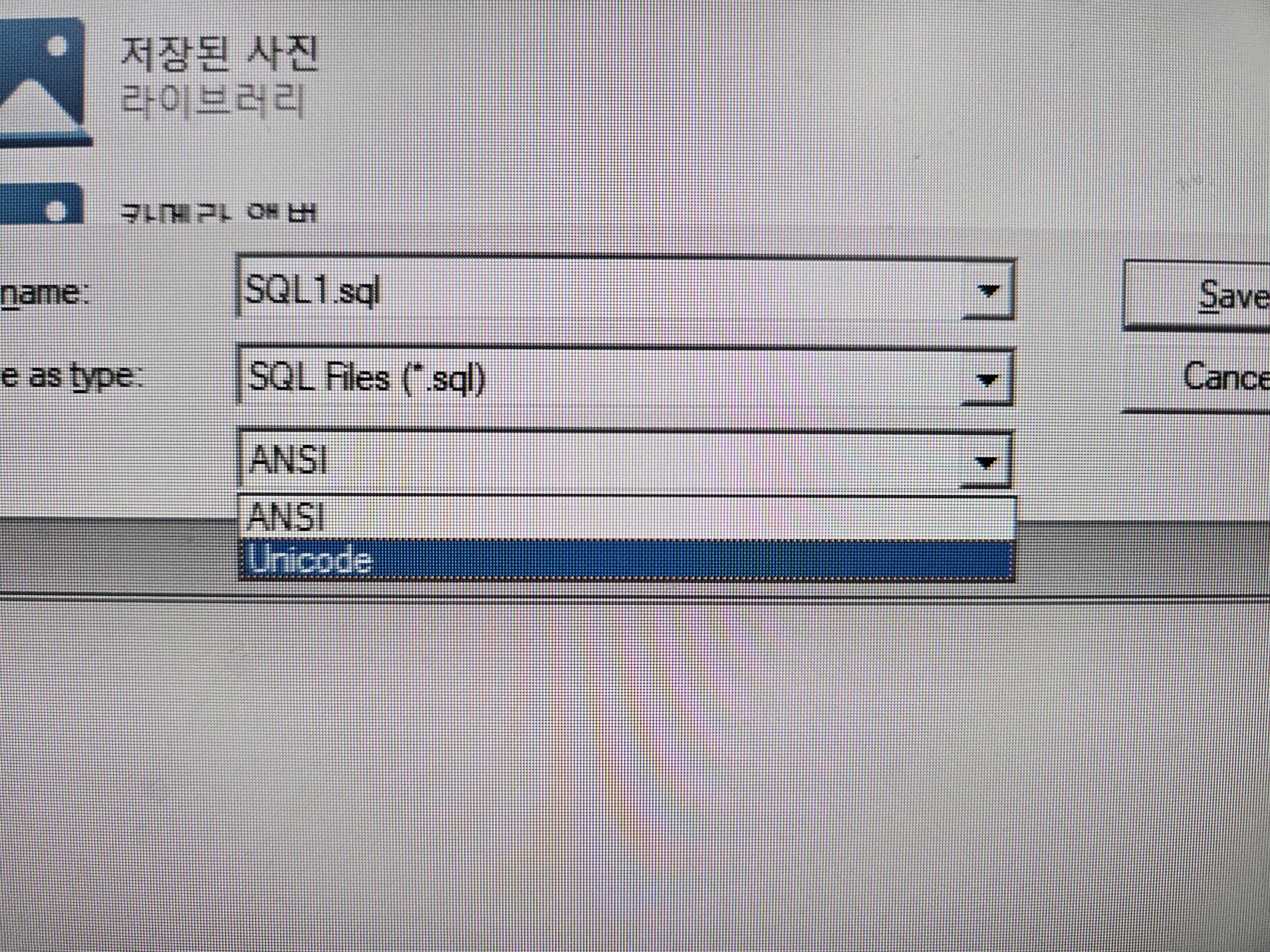 하지만 SQL 파일을 저장할 때 나오는 팝업 화면에서 파일 언어의 설정을 ANSI와 UNICODE를 구분하여 저장할 수 있던데